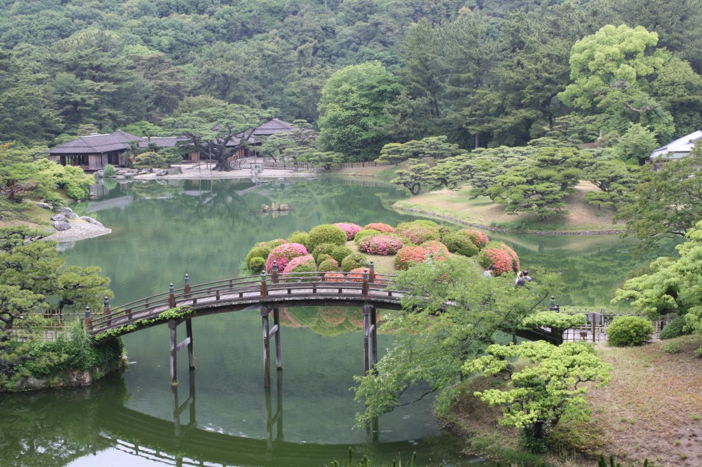 Construit autour de la résidence du daimyo (seigneur féodal) de Takamatsu et achevé durant l’ère Edo en 1745 après une période de cent ans, il comprend 6 étangs et 13 collines paysagères.